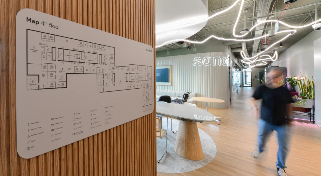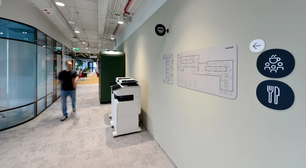 Projekt kompleksowego wayfindingu dla warszawskiej siedziby Sanofi, realizowany we współpracy z The Design Group, był połączeniem funkcjonalności i korporacyjnej elegancji. Celem było stworzenie praktycznego systemu, który harmonijnie wtopi się w wyrafinowane wnętrze. Zaprojektowaliśmy klarowne mapy, subtelne oznakowanie kierunkowe i minimalistyczny system piktogramów w kontrastującej bieli i czerni, co zwiększyło efektywność orientacji w biurze. Zastosowaliśmy dwustronne semafory i podwieszane tablice identyfikujące strefy, a także kluczowe udogodnienia: foliowanie przeszkleń dla prywatności oraz naklejki z alfabetem Braille’a, gwarantujące pełną dostępność przestrzeni dla każdego użytkownika tej przestrzeni.