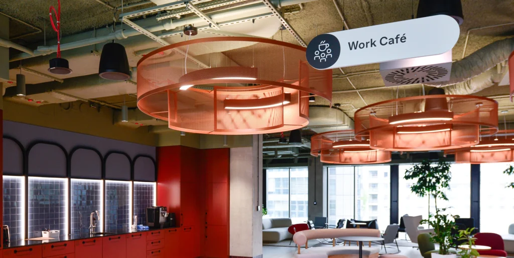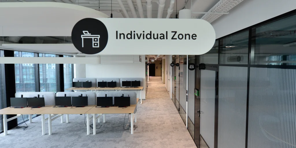 W biurze Ace of Space we wrocławskiej Renomie, wspólnie z architektem Jakubem Wazowiczem-Łaszewskim, stworzyliśmy środowisko pracy, w którym wartości marki są namacalne: nowoczesność, kreatywność i bliskość ludzi. Cała przestrzeń, wyróżniona pierwszym w Polsce Wellbeing Workspace Certificate, została zaprojektowana z myślą o dobrym samopoczuciu i produktywności. Nasz system wayfinding zapewnia intuicyjną nawigację, także z wykorzystaniem z oznaczeń w Braille’u dla pełnej dostępności. Efekt wizualny dopełniają neony, podświetlane logotypy, graffiti i zieleń, które wspólnie budują wyrazisty charakter tej marki.