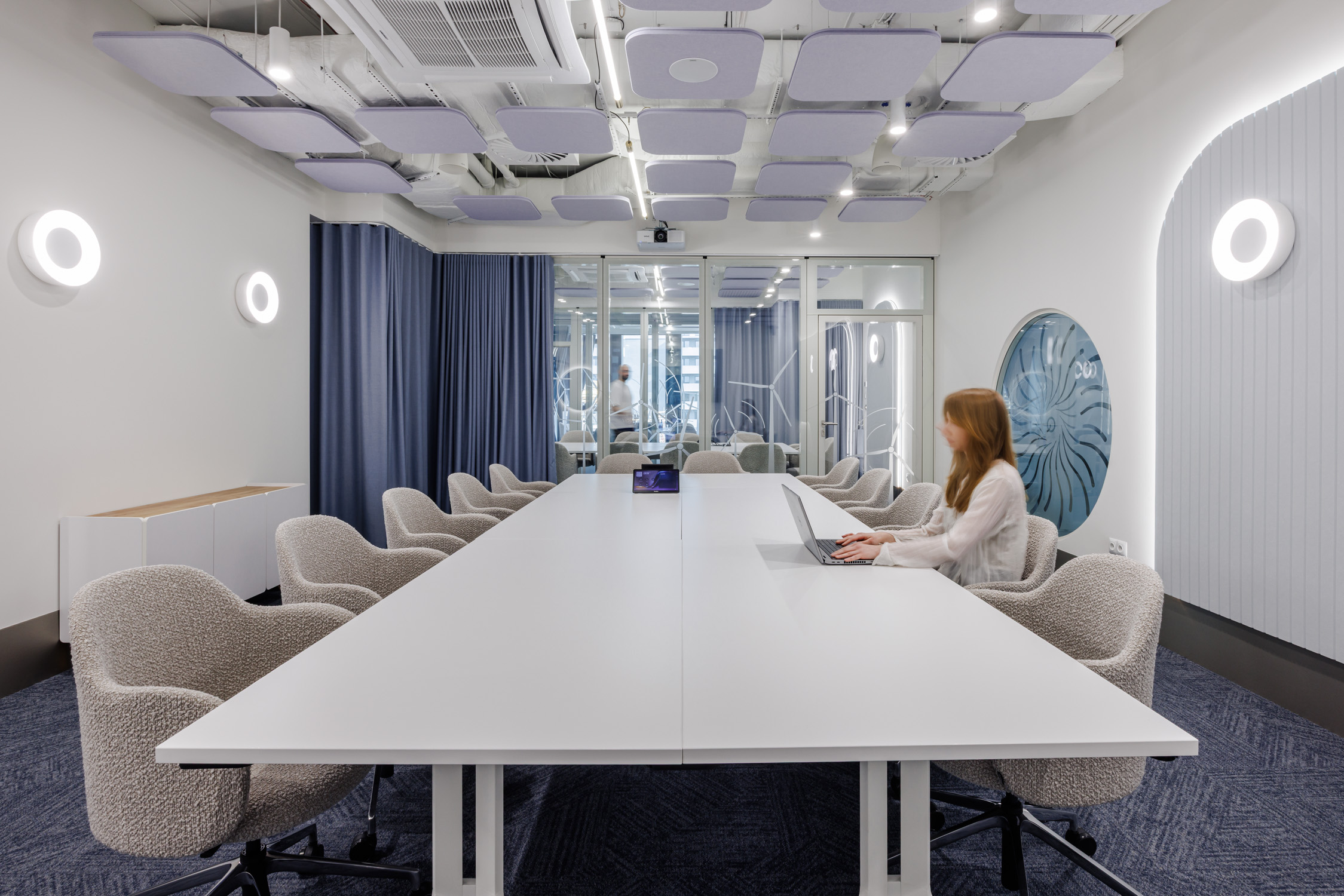 Szklane powierzchnie w biurze Qair Polska S.A. zyskały nową funkcję dzięki grafice autorstwa studia Workplace i foliowaniu. Przestrzeń nie została zamknięta, wręcz przeciwnie, została podzielona światłem. Motywy inspirowane naturą – falami, wiatrem i energią – tworzą delikatne przejścia między strefami, zapewniając prywatność bez utraty otwartości. Folie także wpisują się w ekologiczną narrację marki. Są trwałe, minimalistyczne i w pełni zgodne z zasadami zrównoważonego projektowania.