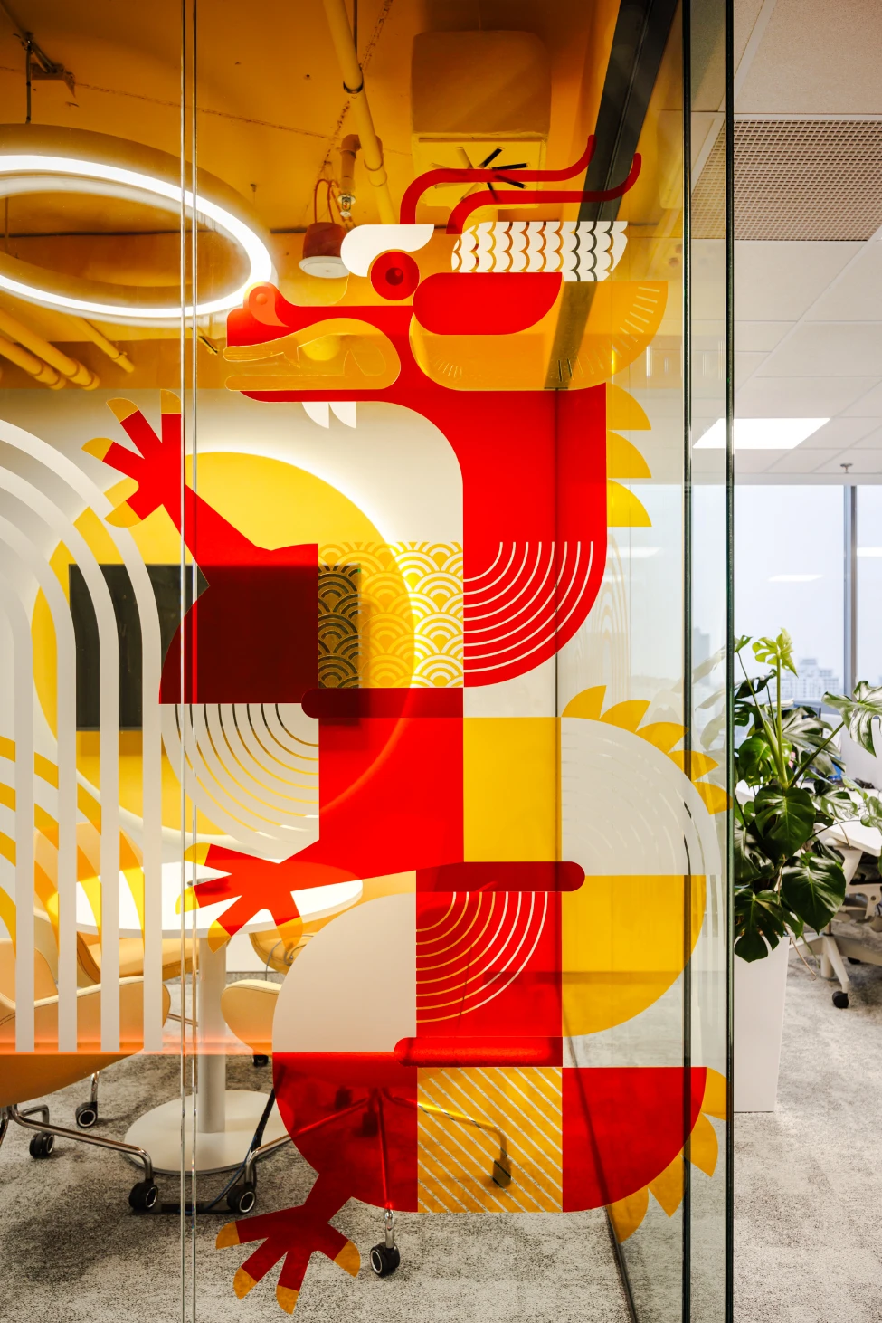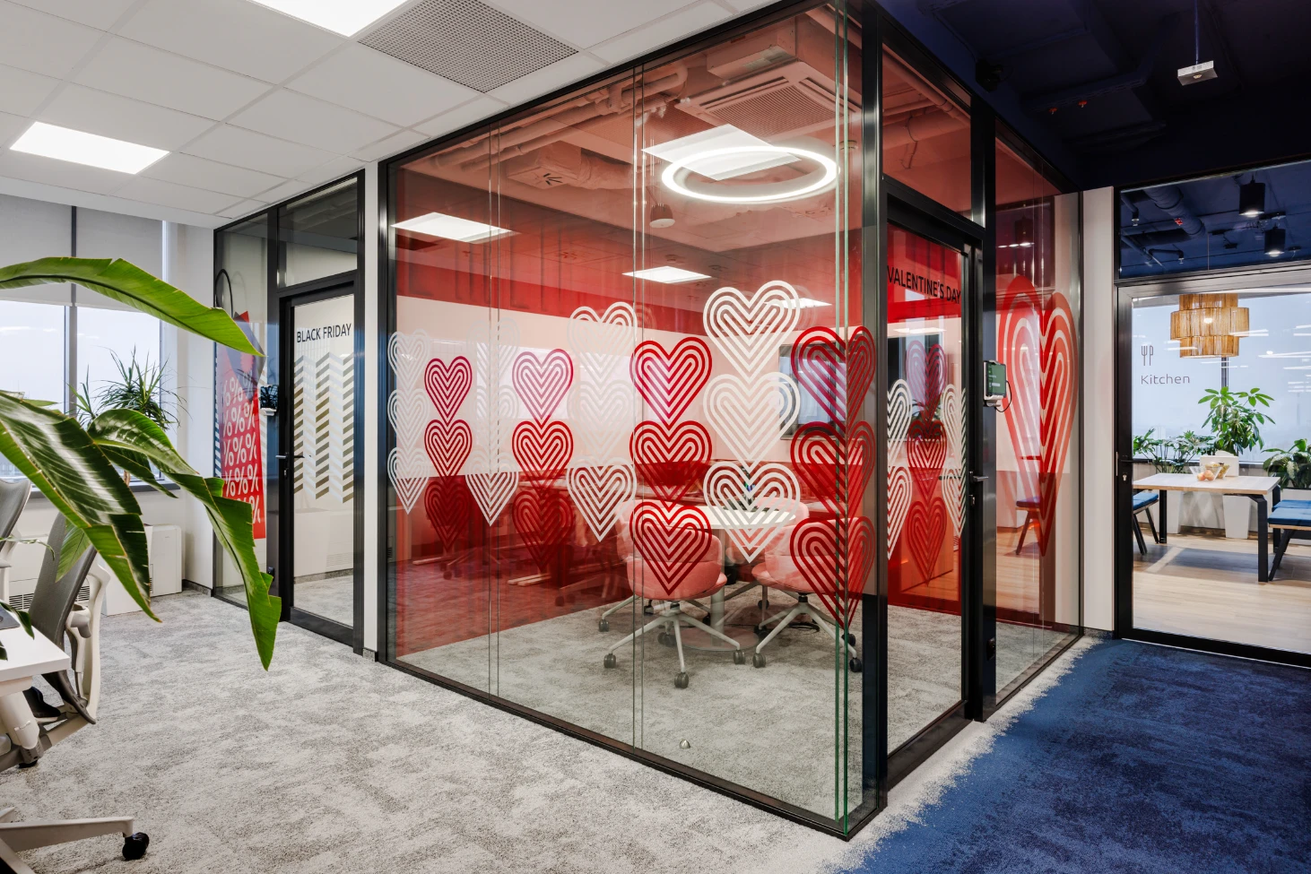 Efekt? W pełnym słońcu biuro wypełnia się kolorowymi refleksami na ścianach i podłogach, tworząc dynamiczną, niemal artystyczną atmosferę. To dowód na to, że funkcjonalność (zapewnienie prywatności) może iść w parze z zachwycającym designem.
