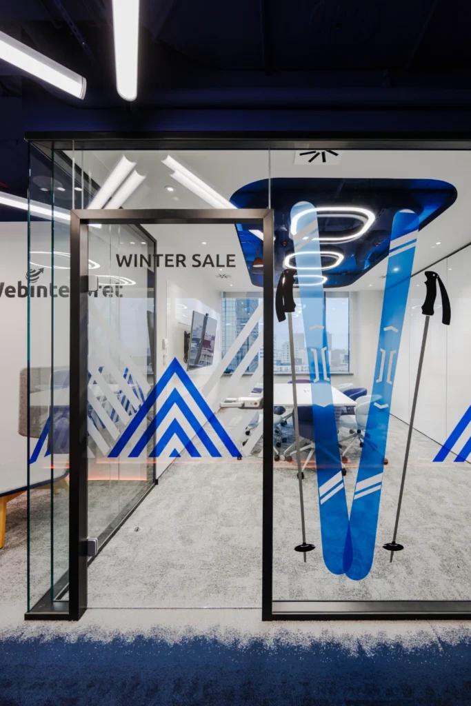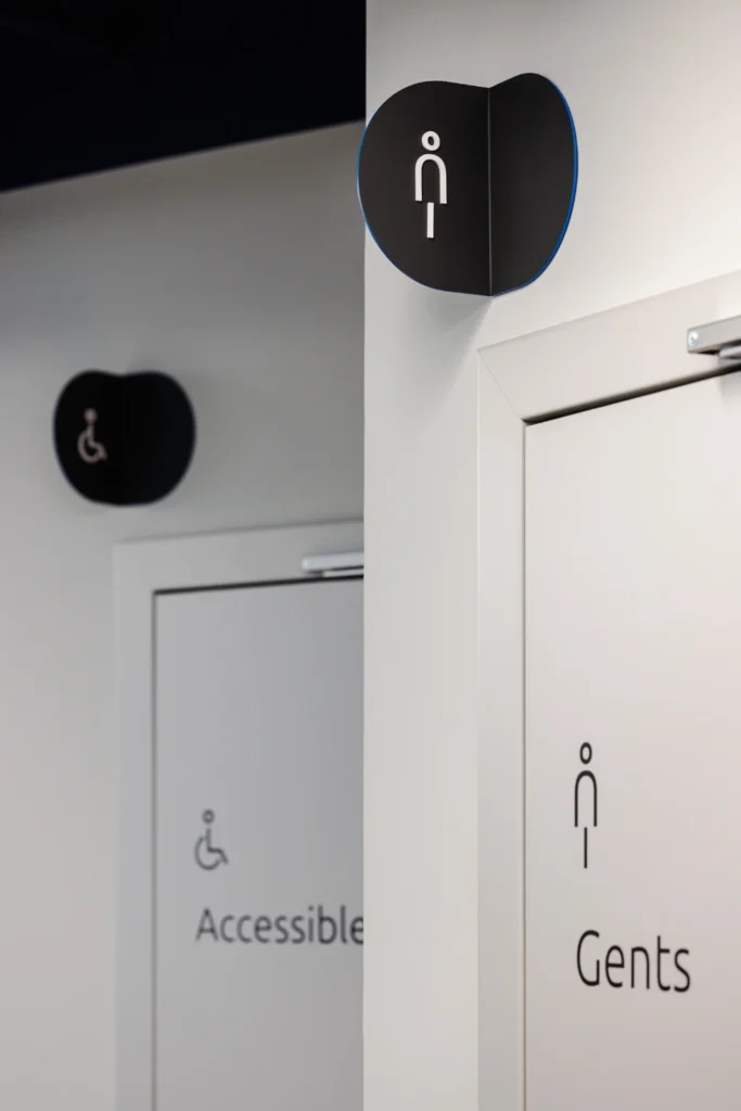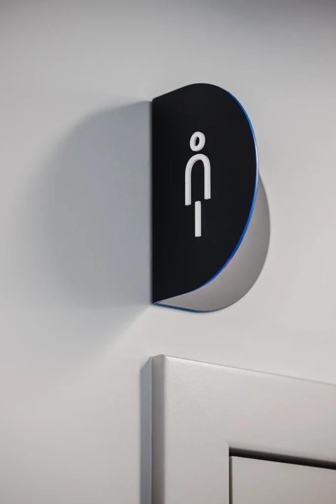 System wayfindingu i oznakowania został w pełni zintegrowany z estetyką wnętrza. Nazwy salek konferencyjnych wkomponowaliśmy bezpośrednio w grafiki ścienne, a funkcje pomieszczeń oraz fronty kuchenne oznaczyliśmy minimalistycznymi piktogramami z folii. Całość dopełniają czytelne semafory, dzięki którym nawigacja po biurze jest intuicyjna i naturalna.